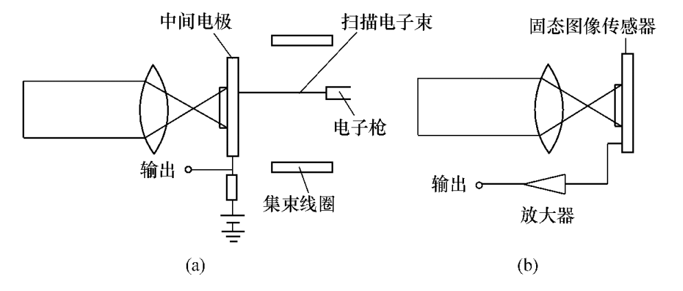 而圖(b)所示的固態(tài)圖像傳感器的輸出信號的產(chǎn)生,不需外加掃描電子束,它可以直接由自掃描半導(dǎo)體襯底上諸像素而獲得。輸出電信號與像素的位置對應(yīng),因而,再生圖像失真度極小。顯然,光導(dǎo)攝像管等圖像傳感器,由于掃描電子束偏轉(zhuǎn)畸變或聚焦變化等原因所引起的再生圖像的失真,往往是很難避免的。圖 攝像管與固態(tài)圖像傳感器原理比較(a)光導(dǎo)攝像管;(b)固態(tài)圖像傳感器。