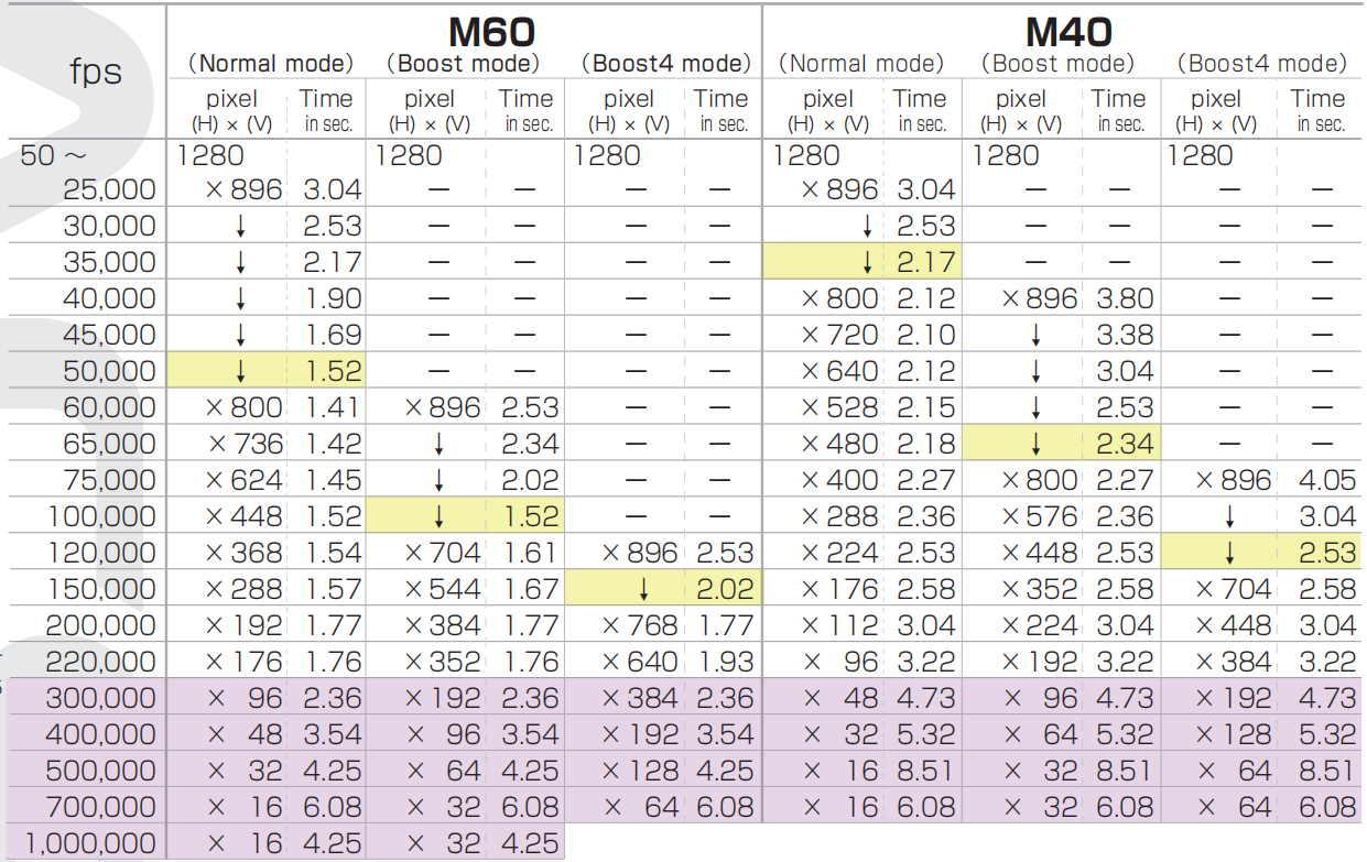 高速攝像機(jī)ACS-1在“Normal mode”、“Boost mode”以及“Boost4 mode”下的參數(shù)對比: